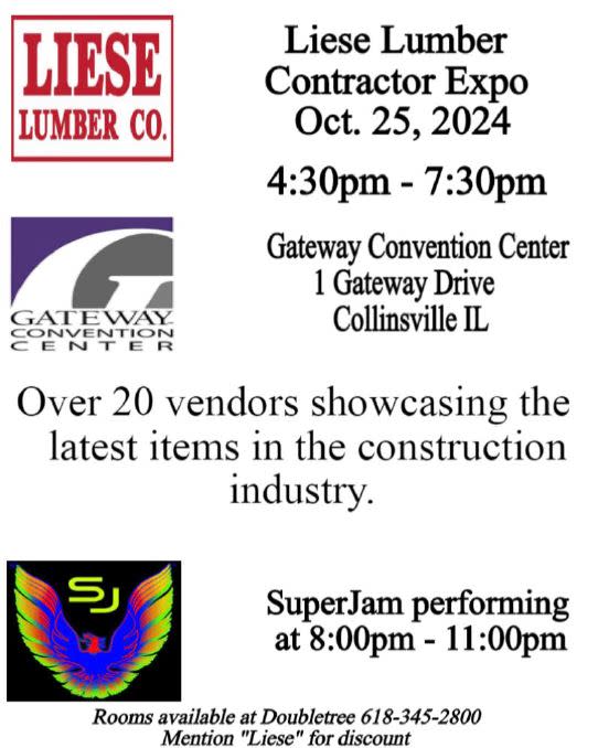 October 25th at Gateway Center in Collinsville starting at 4:30 join the Liese Lumber Customer Appreciation Event with Vendors showcasing the latest items in the COnstruction Industry. The Event is Free to attend and there will be food and beverages with SuperJam BAnd playing that evening form 8-11pm
