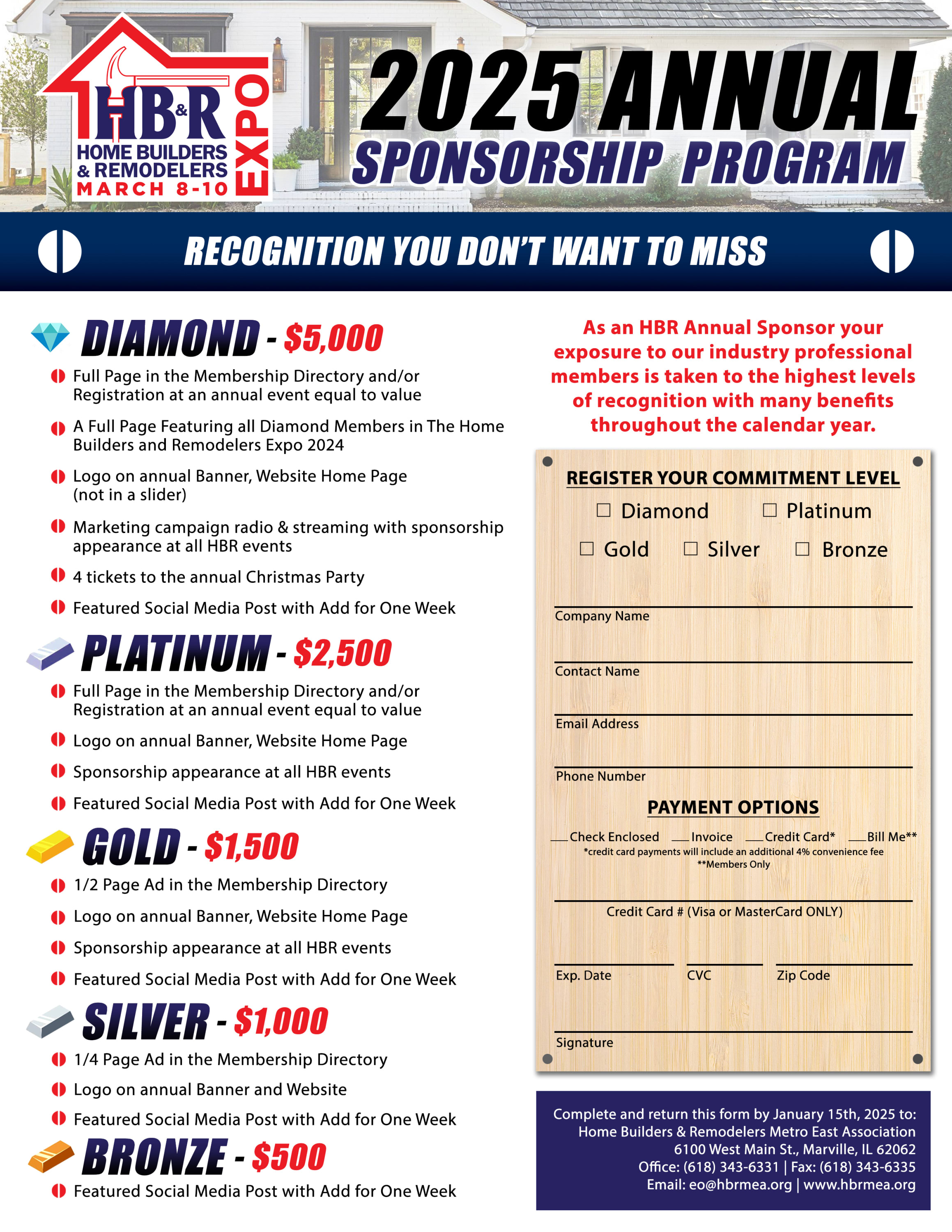 Our 2025 Annual Sponsorship Program is in full swing, This program allows you to support the HBR while at the same time get exposure for your company to members and consumers alike, based on the level of sponsorship that you select. By supporting our annual sponsorship campaign you are supporting the HBR and allowing us to continue to strengthen the organization and continue to advocate for The Home Building Industry. If you have questions feel free to reach out to the office at eo@hbrmea.org or call (618) 343-6331
