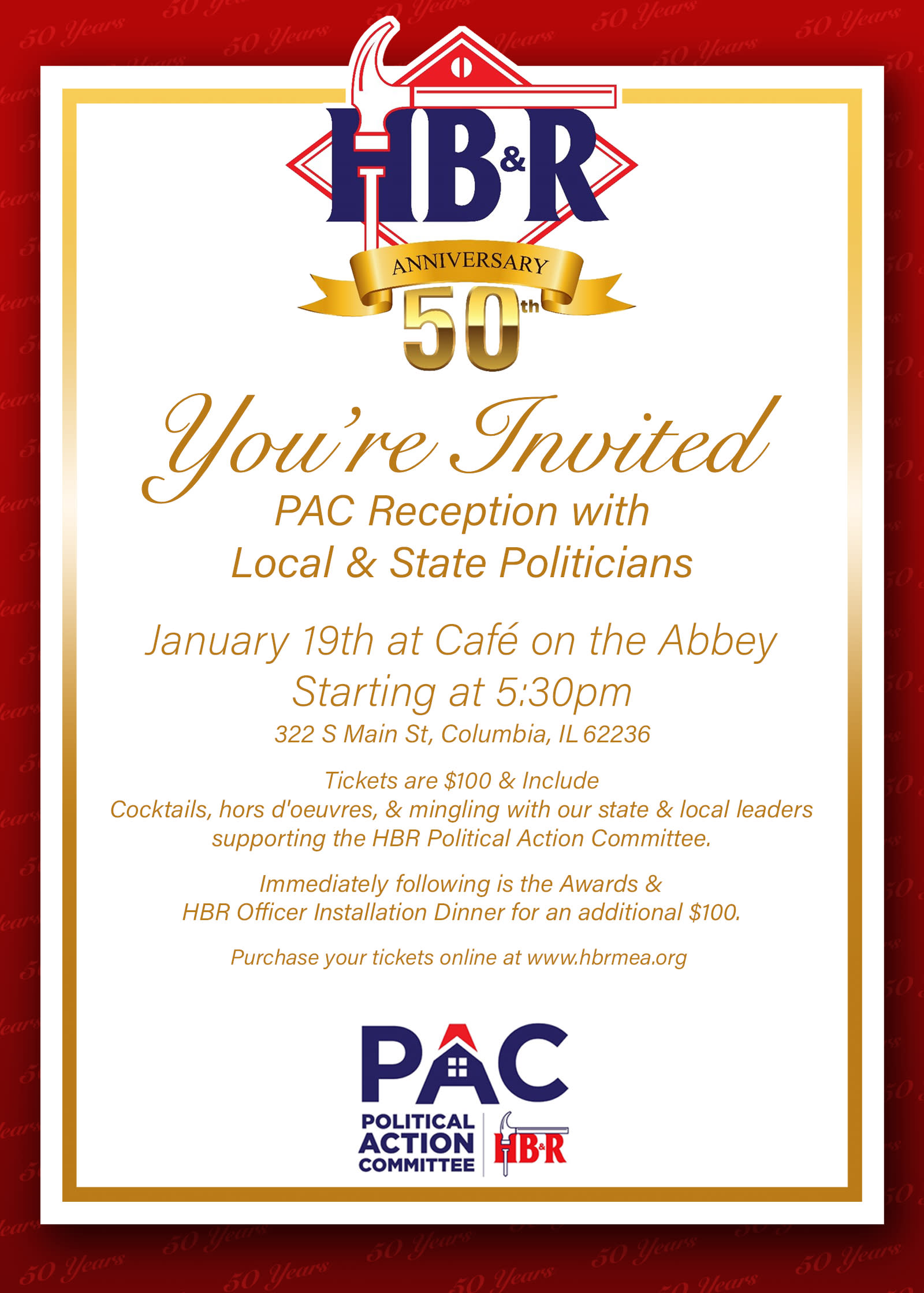 Meet and spend time with our elected officials form the local, state and national level. Enjoy Cocktails and hors d'oeuvres. Help us to continue to make a difference and be the voice of our membership and the housing industry. This is the one PAC fundraiser each year and it is prior to the Installation and Awards dinner at the Abbey in Columbia Illinois 5:30 (tickets purchased separately for the dinner)